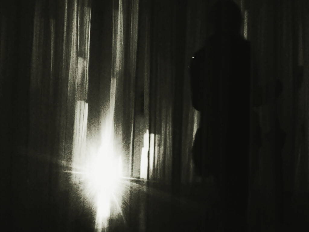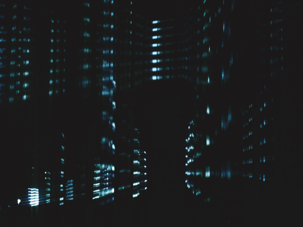 Multimedia installation using 99 transparent textile strips, two projectors, and surround sound for R.A.M. Media Art Festival, Arad, Romania.